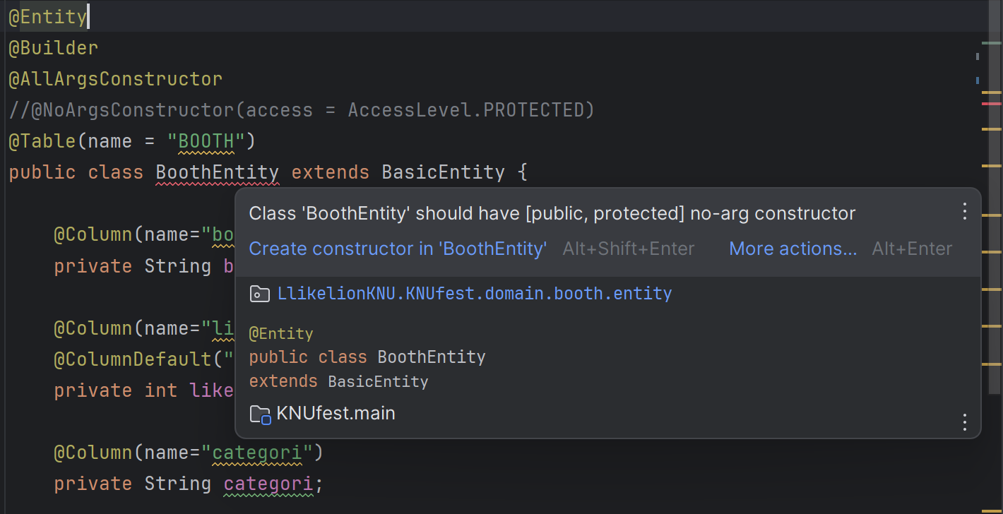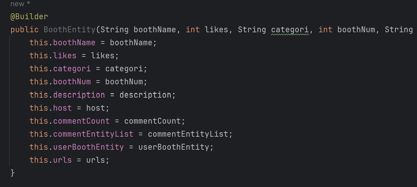 여기서도 빌더 패턴을 쓸 것이다. 근데 주의할 점이 있다. 앞서 우리는 @NoArgsConstructor 를 통해 프록시 객체의 생성자를 만들어줬다. @Builder 어노테이션은 생성자가 없을 경우 자동으로 모든 필드가 들어간 생성자를 생성해준다.