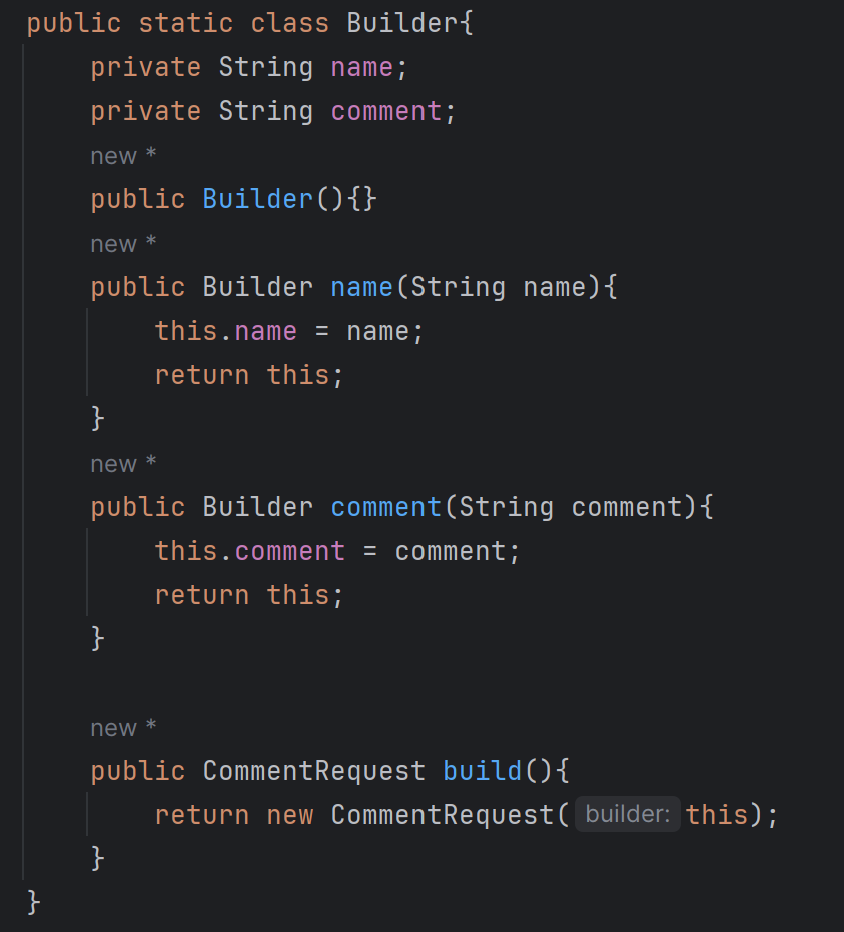 Builder 객체 내부에 CommentRequest 의 필드 값을 복사해준 다음, 각 필드 값마다 초기화 메서드를 만들어준다. 반환 값은 초기화 다음 Builder 자기 자신을 반환함으로써, 초기화 과정을 계속해서 이어나간다.