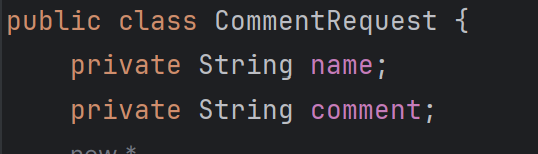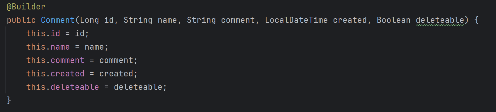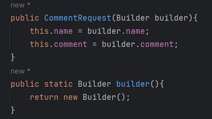 CommentRequest 내부에 builder 메서드로 생성과정을 시작하고, Builder 를 매개변수로 받는 생성자를 통해 객체를 생성하면서 끝난다.