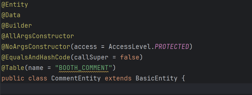 이런 식으로 직접 생성자를 만들어 준 다음 @Builder 를 붙여주면 Entity에 안전하게 빌더패턴을 적용할 수 있다.